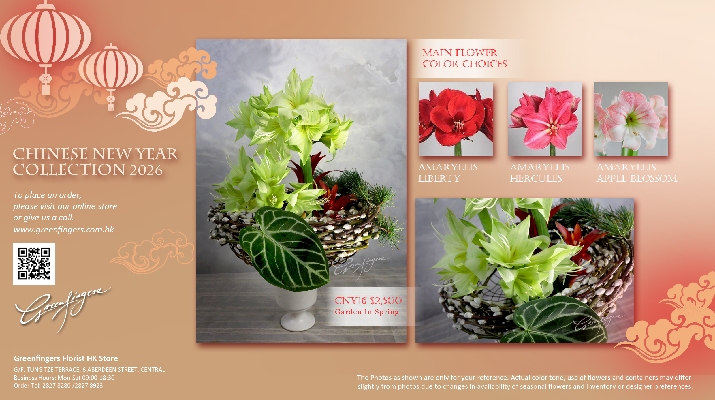 踏進新的一年,我們懷抱希望,帶著無限的期盼,祝願新的一年,萬象更新,事事順境。過不多久,就是我們中國人很重視的一個節日,農曆新年,我們特別設計了一系列賀年應節花藝作品,供大家觀賞、選購。為免向隅,請儘早訂購,有些作品是限量版,請大家詳細查閱以下農曆新年作品專頁並作出行動,為你溫暖的家添上新裝,讓花香遍滿庭園,帶來祝福滿滿。