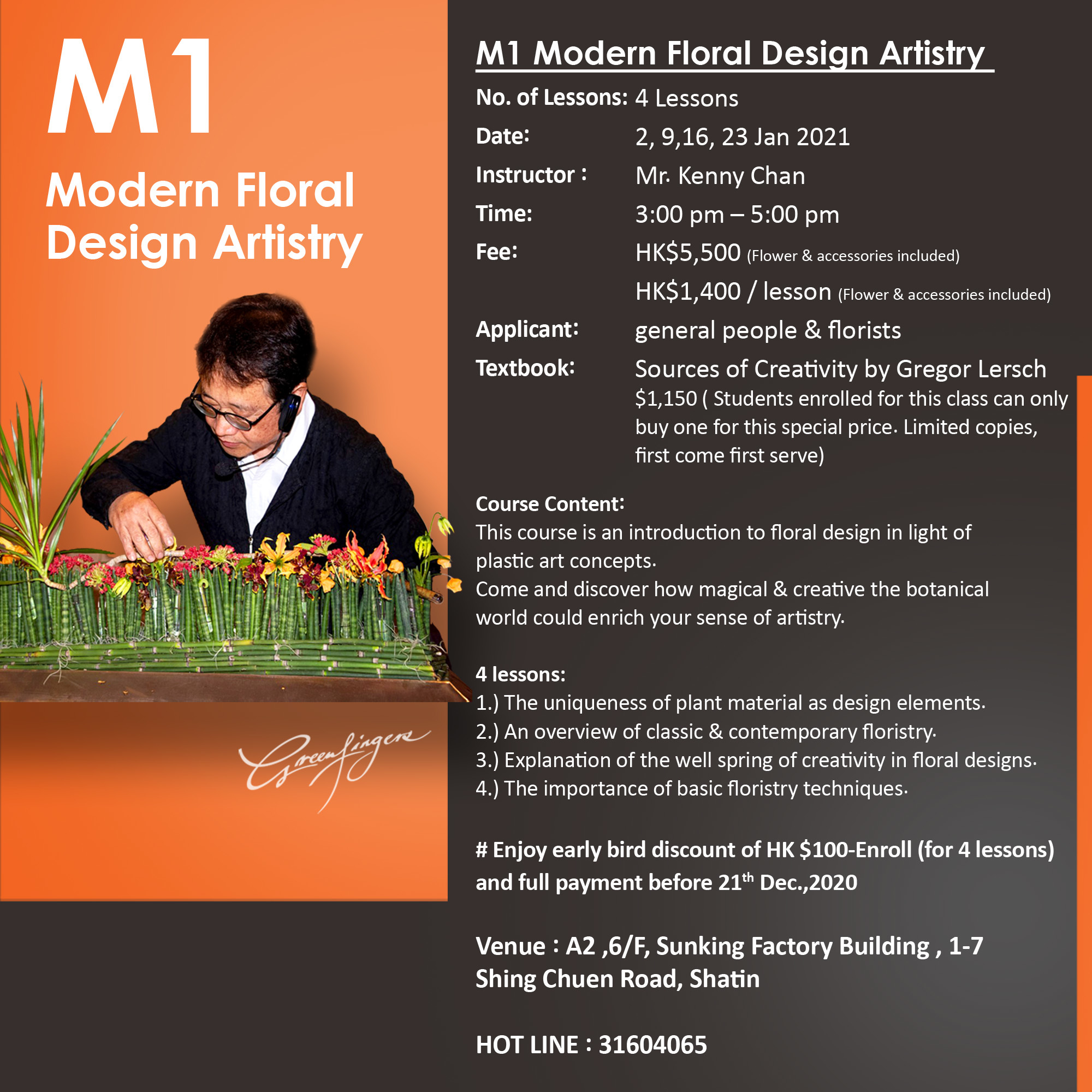 No. of Lessons: 4 Lessons Date: 2, 9,16, 23 Jan 2021 Instructor : Mr. Kenny Chan Time: 3:00 pm – 5:00 pm Fee: HK$5,500 (Flower & accessories included) HK$1,400 / lesson (Flower & accessories included) Applicant: general people & florists Textbook: Sources of Creativity by Gregor Lersch $1,150 ( Students enrolled for this class can only buy one for this special price. Limited copies, first come first serve) Course Content: This course is an introduction to floral design in light of plastic art concepts. Come and discover how magical & creative the botanical world could enrich your sense of artistry. 1.) The uniqueness of plant material as design elements. 2.) An overview of classic & contemporary floristry. 3.) Explanation of the well spring of creativity in floral designs. 4.) The importance of basic floristry techniques.