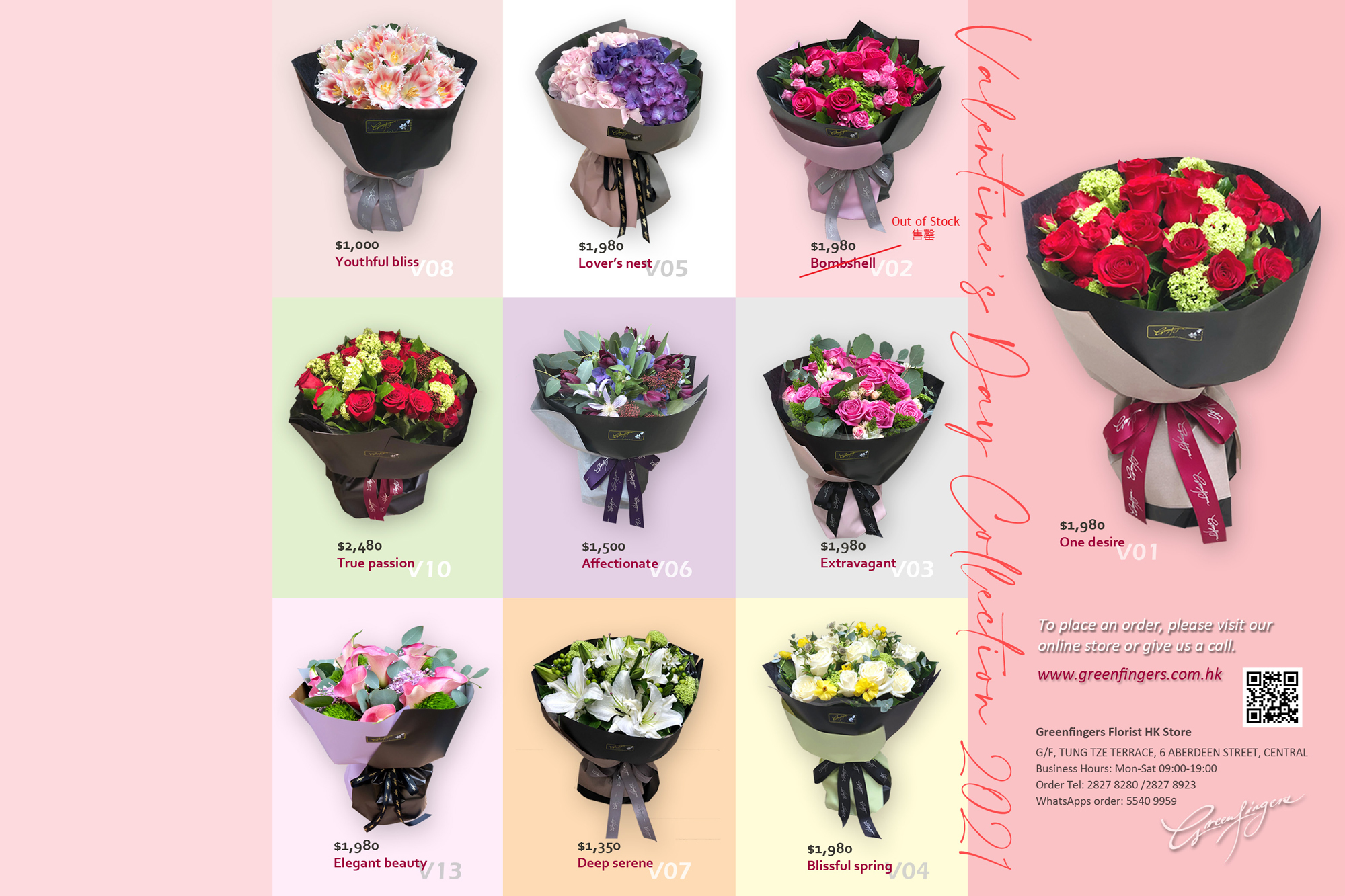 我們特地為今個情人節創作了一系列花藝作品,亦為每個作品命名,添加了其獨特性及個性,提昇了花藝作品所傳達的訊息,傳遞無盡的愛意。有些作品是限量版,為免向隅,請從速訂購。